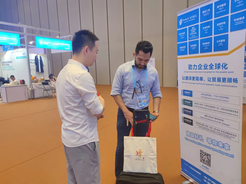 譯國譯民展位憑實力“圈粉”,現場展示了涵蓋口譯、筆譯、本地化在跨境電商、會議會展、醫療醫藥、文創圖書、國際工程等多領域的多語言服務。同時,現場的客戶經理為觀展的境內外采購商、跨境貿易企業進行專業且耐心的服務方案講解。